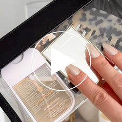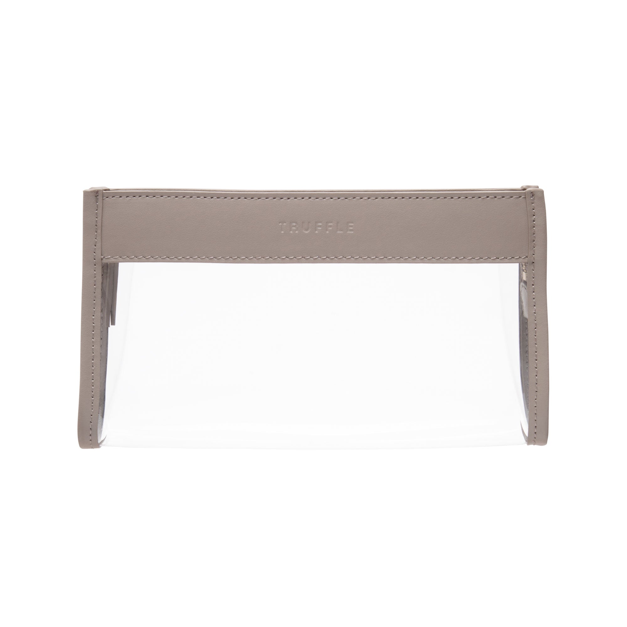 This chic mini clear pouch, trimmed in beautiful Napa leather, features a convenient top-zip opening for effortless access. It’s the perfect solution for keeping your everyday essentials—like lipsticks, hair clips, compacts, and those small, easy-to-misplace items—stylishly organized and always within reach. It's chic enough as a stand-alone clutch.