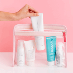 Our roomiest pouch for packing full size bottles, tubes and brushes and can be chicly stowed in a beach bag or checked luggage.