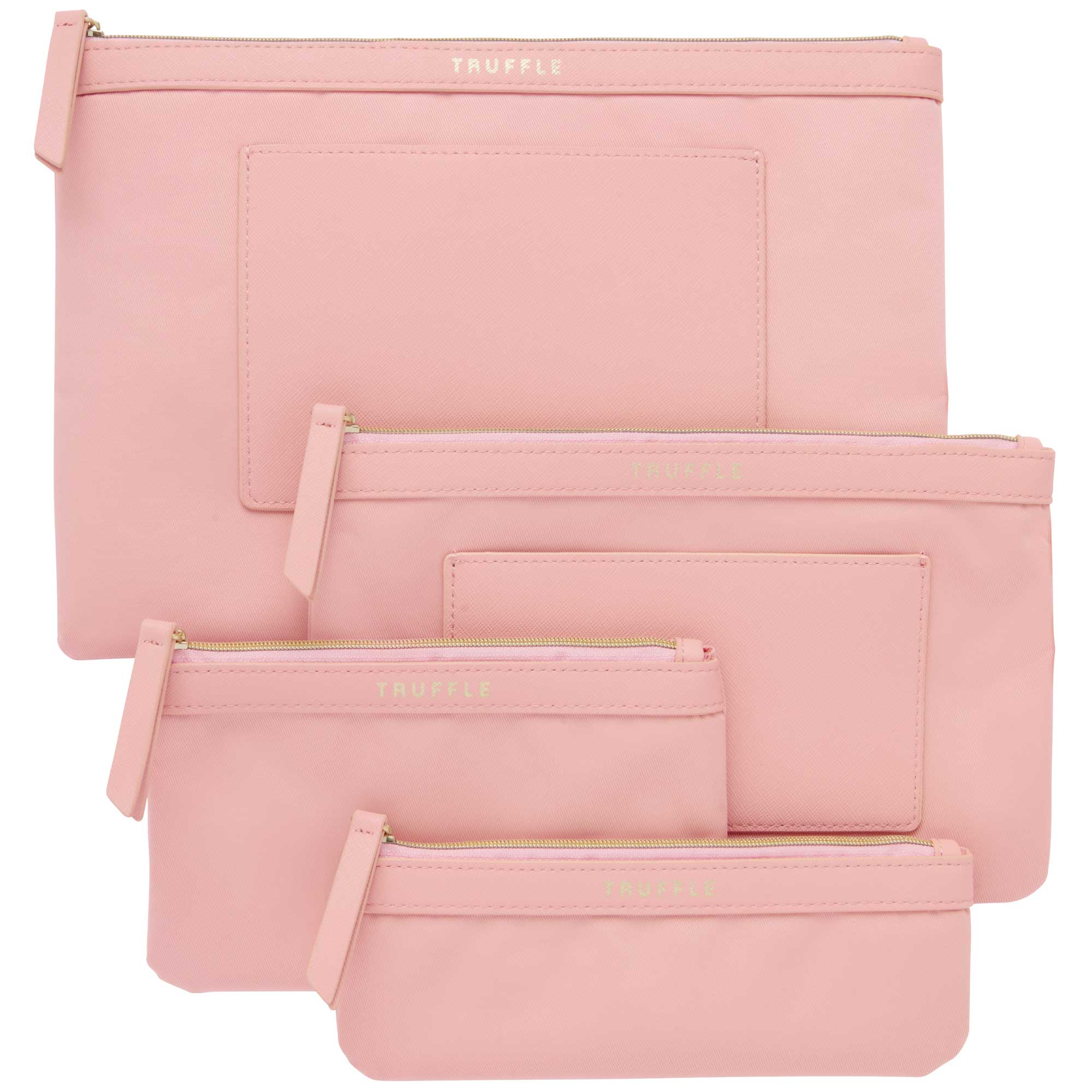 It's pouch perfection! Elevate your organization routine with this sleek set of four sustainable, wipeable, chic nylon pouches that can be slipped neatly inside a Clarity Clutch, tossed in a tote, or stowed in your carry-on or checked luggage. The largest pouch bag is padded to protect your tech/tablets. Designed to complement your clear Truffle clutches and cases.
